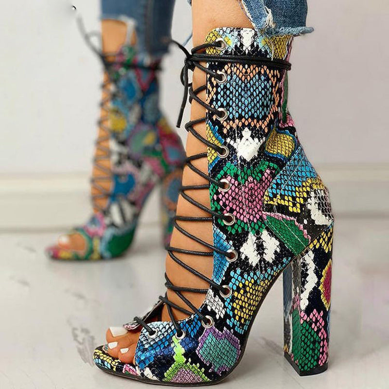 Cross Strap Snake Print Thick Heel Large Size Women's Sandals