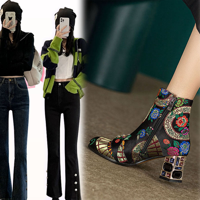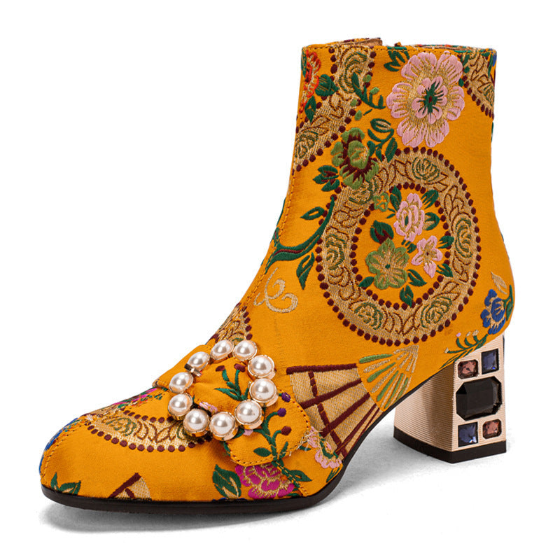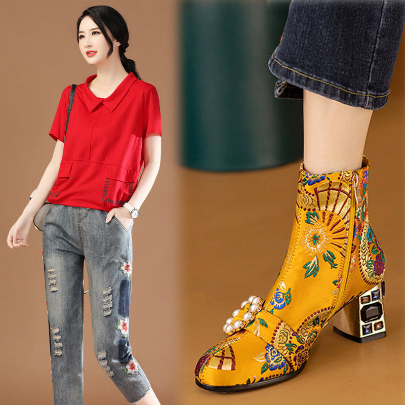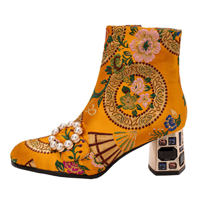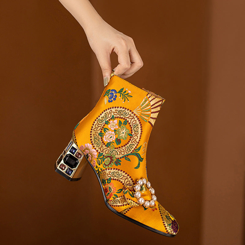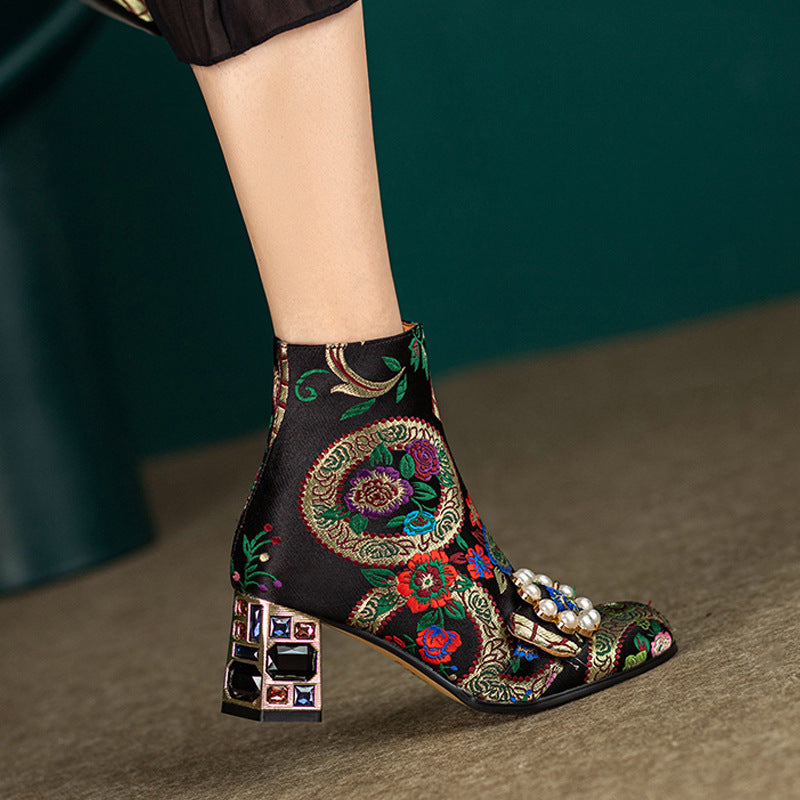 Ethnic Style Round Toe Pearl Buckle Flower Embroidery Chunky Heel Ankle Boots