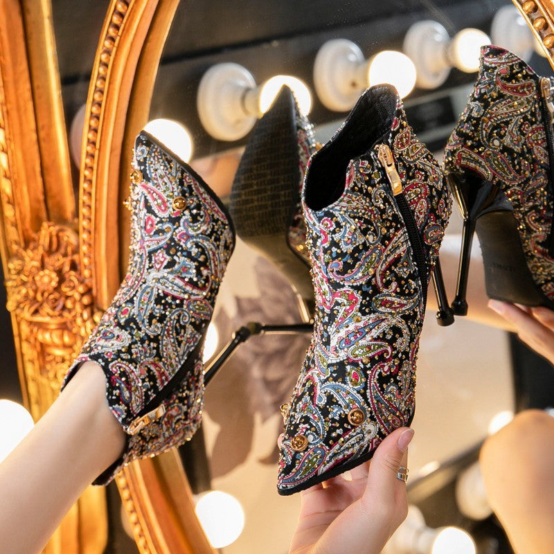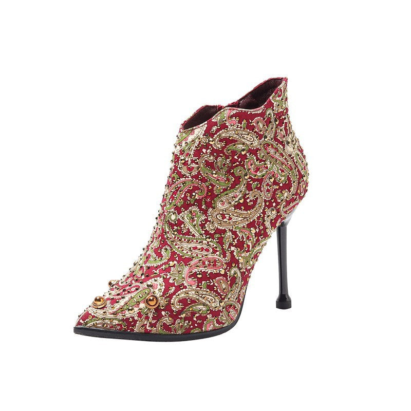 Pointed Toe Stiletto Ankle Floral Rhinestone Women's Boots